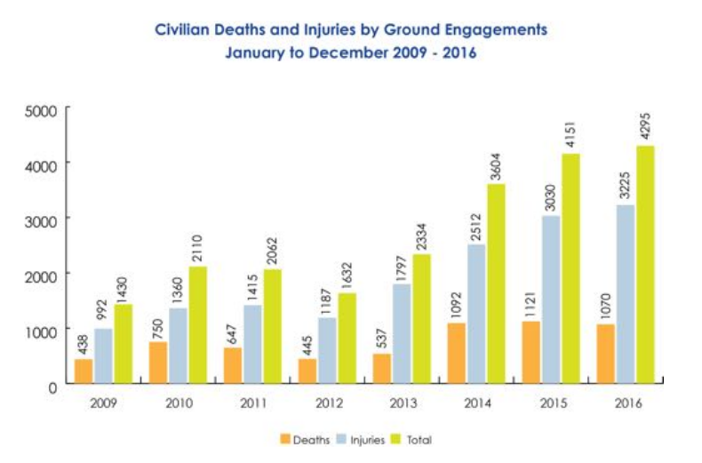 Il 2016 ha visto tra l’altro anche l’aumento delle vittime da bombardamento e il preoccupante rafforzamento di Daesh: il numero di vittime dell’Isis nel 2016 è dieci volte tanto rispetto a quello registrato nell’anno precedente (le persone colpite nel 2015 erano 82, nel 2016 sono state documentate 899 vittime).